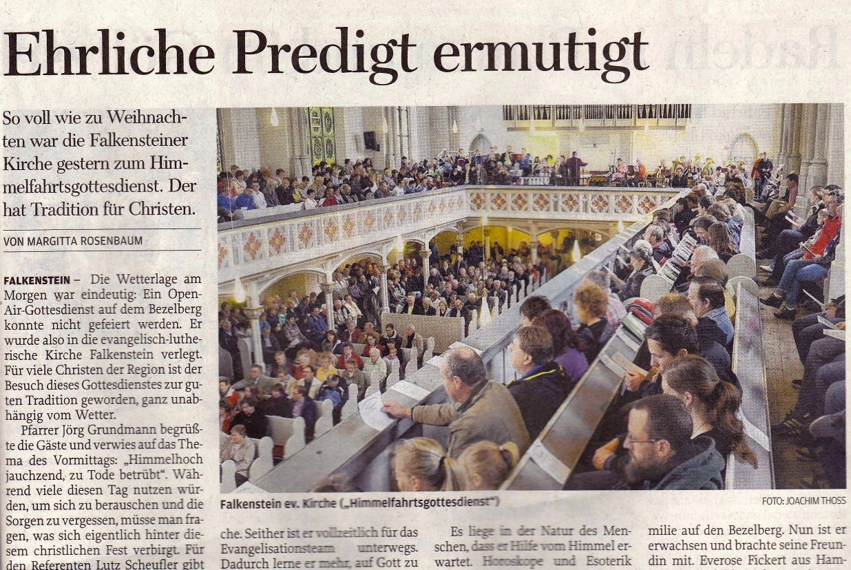 „Das war eine ehrliche Predigt mit vielen Vergleichen und sehr lebendig“, begeisterte sich Felix Wendler aus Rothenkirchen nach dem Gottesdienst. Er gehörte zu den jugendlichen Besuchern … Everose Fickert aus Hammerbrücke fühlte sich ermutigt von der vollen Kirche. „Wir sollen als Christen Zeugen sein. Da macht so eine Veranstaltung Mut“, sagte sie.