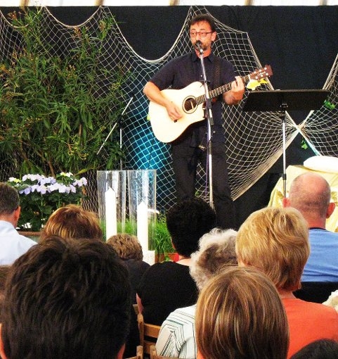 Im Vorprogramm wird für die Zuschauer das Märchen vom König und dem Narren inszeniert. Alle Menschen seien Geschöpfe Gottes, verkündet Prediger Scheufler aus Waldenburg in Sachsen. Doch erst, wenn sie Gott in ihr Leben hinein ließen, würden sie zu „Kindern Gottes“. „Licht, Luft, Wasser und Wärme braucht der Mensch. Er wächst blüht und gedeiht aber nur durch die Liebe“, singt der Evangelist – und der Musiker Scheufler schafft es dabei, gleichzeitig Gitarre und Mundharmonika zu spielen und hin und wieder zwischen den Liedern einen Witz und eindrückliche Worte einzustreuen. Zum Thema des Abends „Gott will alle, trotz Reisen ohne Ziel“ merkt Scheufler an, dass ihn der Spruch „Der Weg ist das Ziel“ nicht überzeugt. Es müsse einen Halt- und Orientierungspunkt geben, der über die alltäglichen Belanglosigkeiten hinausgehe. Sonst laufe der Mensch Gefahr, nur „zu suchen und nichts zu finden“.