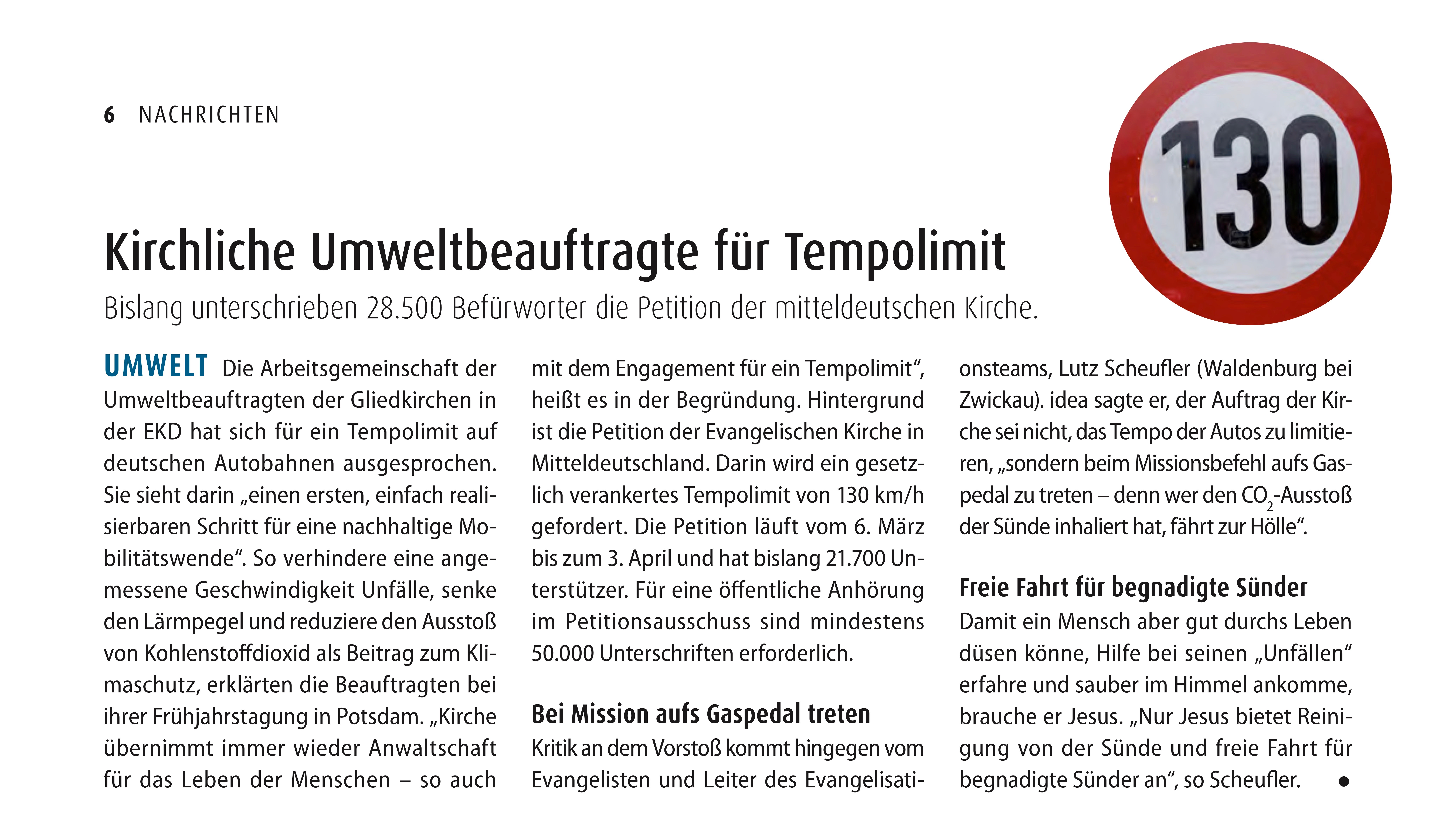 Kritik an dem Vorstoß kommt hingegen vom Evangelisten und Leiter des Evangelisationsteams, Lutz Scheufler (Waldenburg bei Zwickau). idea sagte er, der Auftrag der Kirche sei nicht, das Tempo der Autos zu limitieren, „sondern beim Missionsbefehl aufs Gaspedal zu treten – denn wer den CO2-Ausstoß der Sünde inhaliert hat, fährt zur Hölle“. Damit ein Mensch aber gut durchs Leben düsen könne, Hilfe bei seinen „Unfällen“ erfahre und sauber im Himmel ankomme, brauche er Jesus. „Nur Jesus bietet Reinigung von der Sünde und freie Fahrt für begnadigte Sünder an“, so Scheufler.
