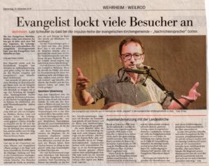 … Was macht einen Evangelisten anno 2018 aus? „Die vier Evangelisten Matthäus, Markus, Lukas und Johannes haben die Lebensgeschichte Jesu aufgeschrieben und weiter gegeben“, erklärte Scheufler im Gespräch mit der TZ nach den Veranstaltungen. Ich versuche nicht nur die Botschaft Jesu weiterzugeben, sondern eröffne auch die Möglichkeit, dass die Menschen dafür Platz im Herzen finden.