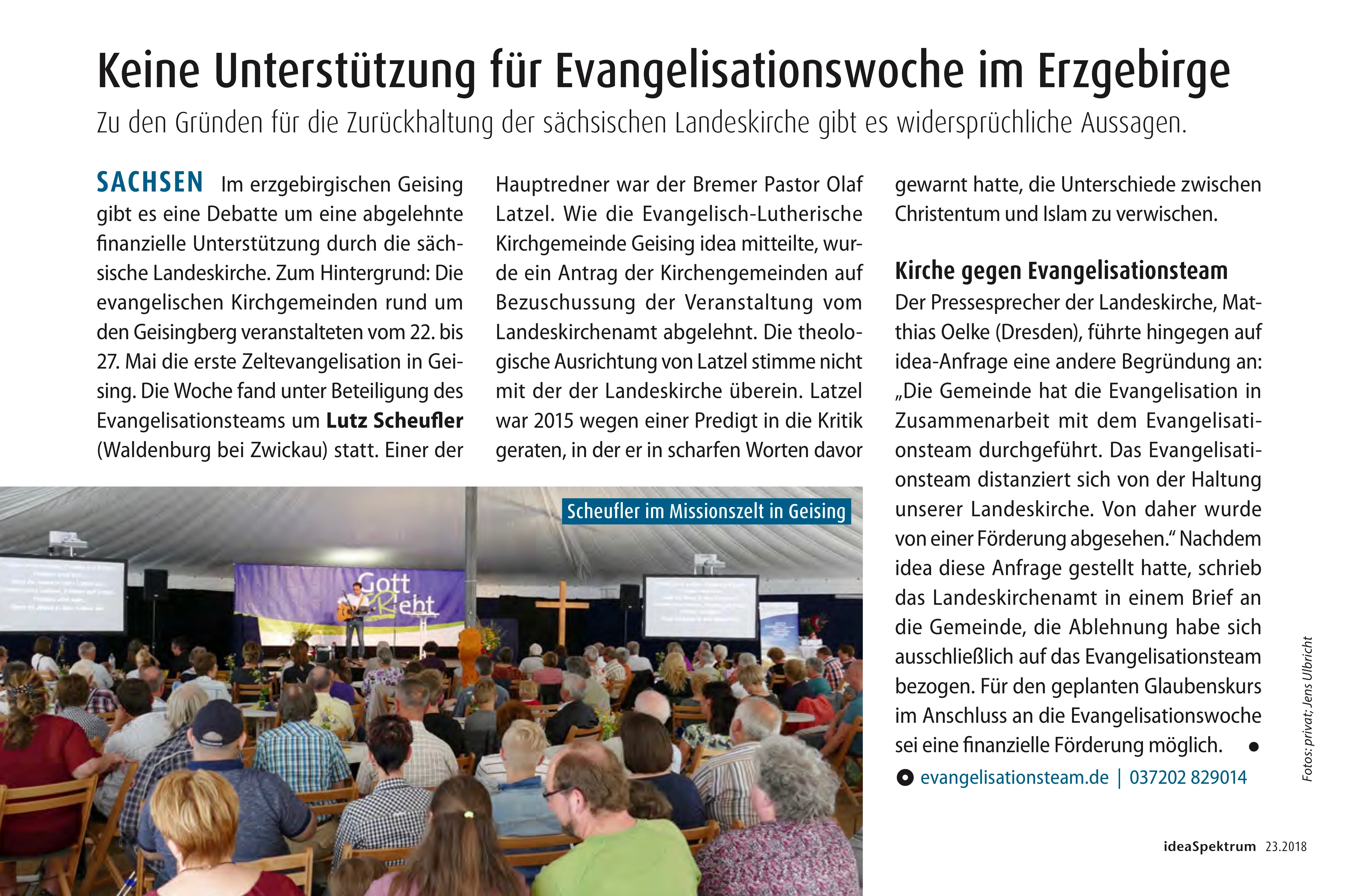 Geising/Waldenburg (idea) – Im erzgebirgischen Geising gibt es eine Debatte über eine abgelehnte finanzielle Unterstützung durch die Evangelisch-Lutherische Landeskirche Sachsens. Zum Hintergrund: Die evangelischen Kirchgemeinden rund um den Geisingberg veranstalteten vom 22. bis 27. Mai die erste Zeltevangelisation in Geising. Die Woche fand unter Beteiligung des Evangelisationsteams um Lutz Scheufler (Waldenburg bei Zwickau) statt. Einer der Hauptredner war der Bremer Pastor Olaf Latzel. Wie die Evangelisch-Lutherische Kirchgemeinde Geising der Evangelischen Nachrichtenagentur idea mitteilte, wurde ein Antrag der Kirchengemeinden auf Bezuschussung der Veranstaltung vom Landeskirchenamt abgelehnt. Eine Mitarbeiterin habe in einem Telefongespräch der Gemeinde mitgeteilt, die theologische Ausrichtung von Latzel stimme nicht mit der der Landeskirche überein. Latzel war 2015 wegen einer Predigt in die Kritik geraten, in der er in scharfen Worten unter anderem davor gewarnt hatte, die Unterschiede zwischen Christentum und Islam zu verwischen.